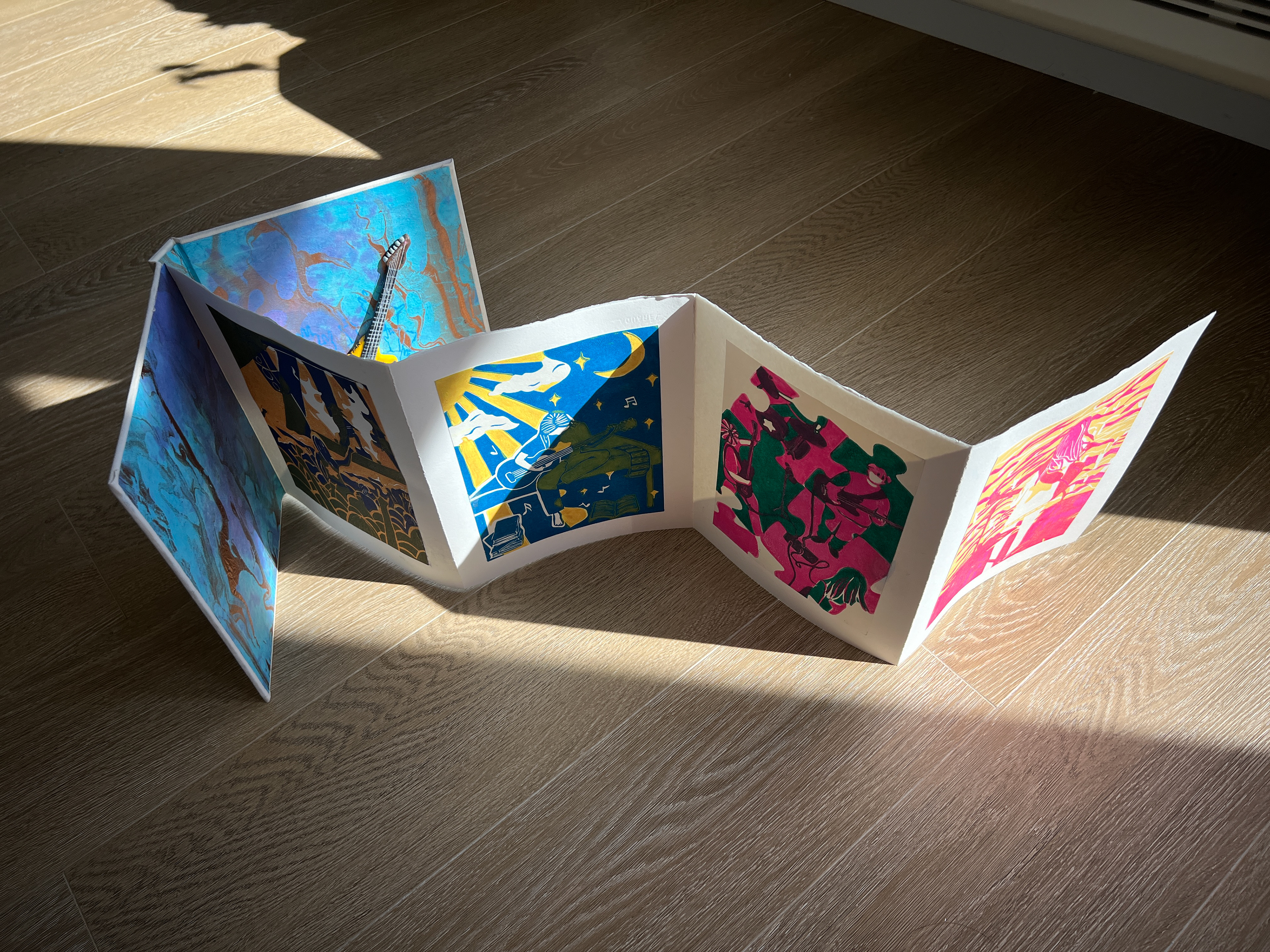 This is my first prints, I use Linoleum boards to made the printing master boards. The goal of the project is usingĀ 2 different prints (2 colors) to make one image, these two colors should created 4 colors (including white part).